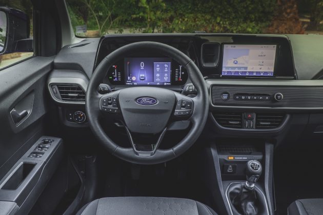 Tot la capitolul comportament rutier merită menționat faptul că noul Ford Courier, în ciuda caroseriei „pătrățoase”, asigură o stabliltate demnă de invidiat chiar și în virajele strânse. În timpul testului – desfășurat atât pe autostradă cât și pe drumuri pline de viraje – dinamica vehiculului s-a dovedit mult superioară unor modele similare, iar sistemele de asistență a șoferului și-au demonstrat dn plin utilitatea. Aici vorbim inclusiv despre păstrarea benzii de rulare, recunoașterea semnelor de circulație și, mai ales, Intelligent Adaptive Cruise Control, sistem opțional care păstrează atât distanța față de alte vehicule, dar și modifică viteza vehiculului în funcție de indicatoarele rutiere. Ba chiar permite setarea unei toleranțe. În cazul rulării pe autostradă acest sistem s-a dovedit extrem de util, însă pe drumurile cu viraje el necesită o atenție sporită din partea șoferului dat fiind faptul că, ghidat de indicatoarele de viteză de pe marginea șoselei, „uită” să reducă viteza în viraje. Prin urmare, așa cum îndeamnă și producătorul, șoferul trebuie să țină tot timpul mașina sub control fără a se baza strict pe caracteristicile inteligente ale acesteia. Un alt atu al noului Courier este și sistemul SYNC 4 cu conectivitate Apple CarPlay și Android Auto fără fir.