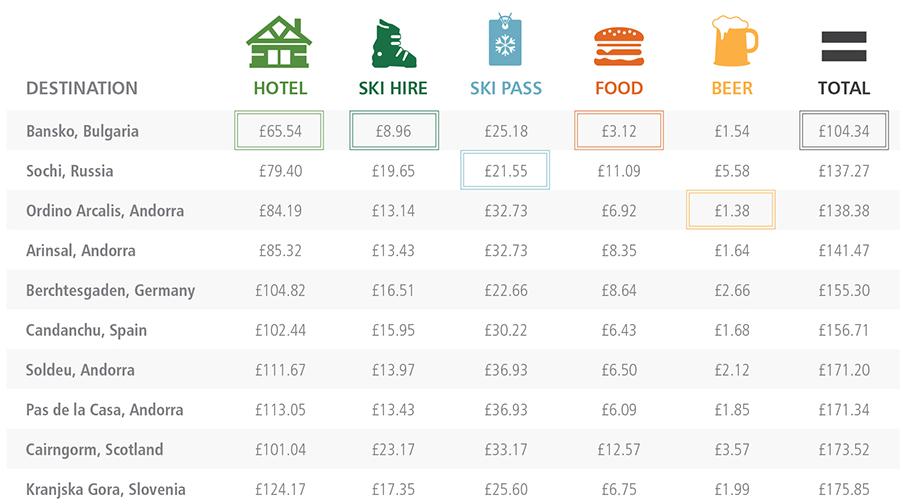 O zi pe pârtie, o masă, o bere și o noapte de cazare la un hotel din Bansko costă 104 lire sterline, cu mult mai puțin față de cea mai scumpă stațiune, Courchevel, Franța, unde prețul depășește 432 de lire sterline.