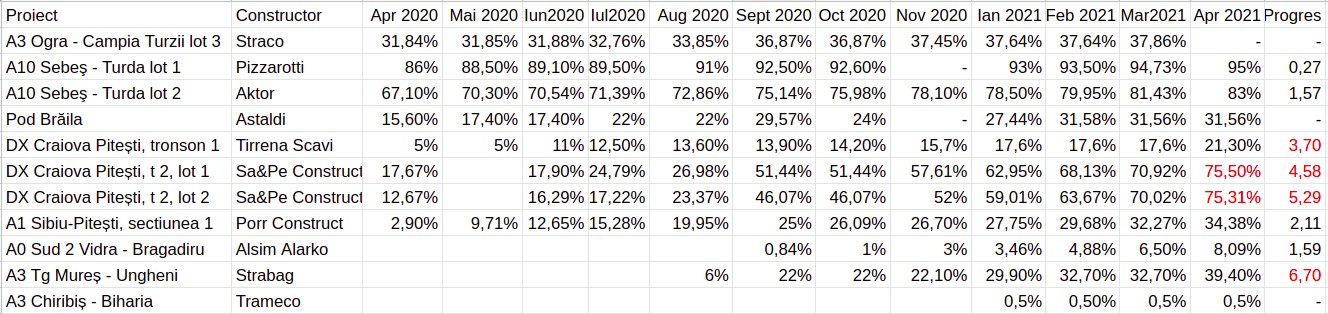 Cele mai mari progrese la autostrăzi au fost înregistrate pe șantierele constructorilor Strabag, UMB și Tirrena Scavi de pe Autostrada Transilvania (A3), respectiv Drumul Expres Craiova - Pitești (DX12), potrivit raportărilor pe luna aprilie către Compania Națională de Administrare a Infrastructurii Rutiere (CNAIR).