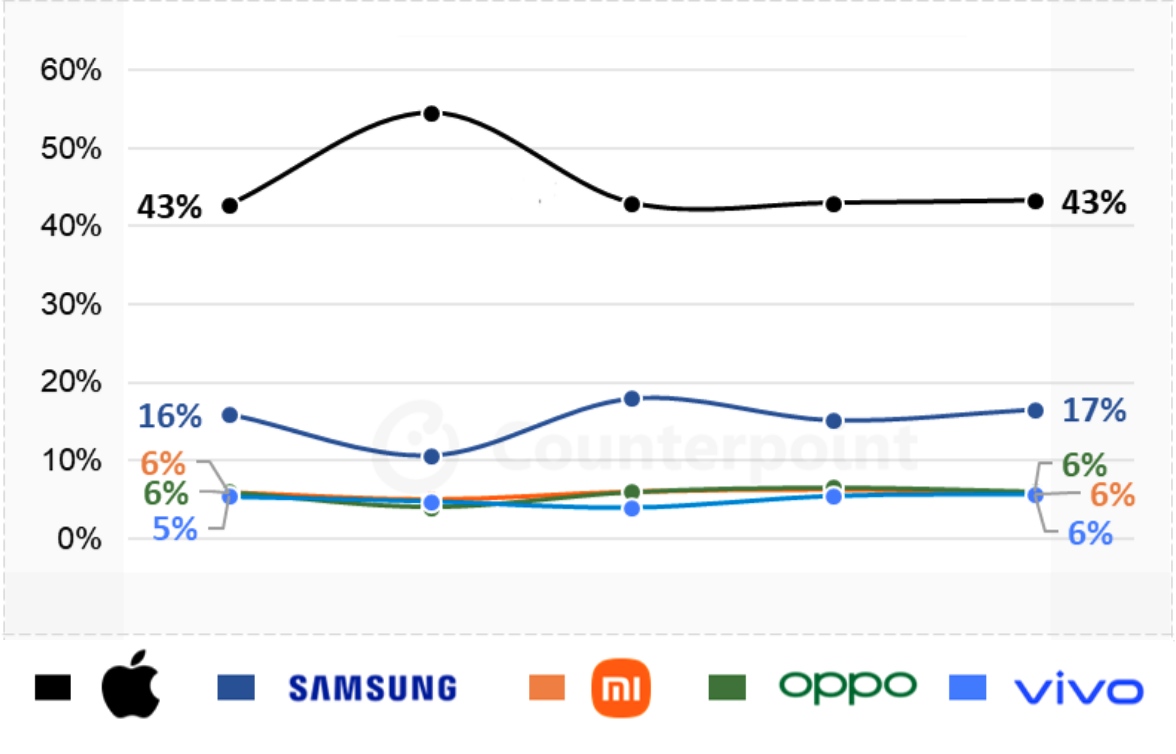 Apple a înregistrat cel mai bun trimestru al treilea din istorie în ceea ce privește veniturile (creștere de 6% față de anul precedent), în ciuda unei ușoare scăderi a prețului mediu de vânzare, deoarece creșterea livrărilor (9% față de anul precedent) a compensat impactul prețului mediu de vânzare datorită unei game mai largi de produse. Seria iPhone 17 are performanțe mai bune decât seria iPhone 16, versiunea de bază având rezultate bune în toate regiunile. iPhone 16e a adăugat și mai multă diversitate portofoliului. Acest impuls pozitiv este susținut de o creștere puternică pe piețele emergente, o tendință care, conform estimărilor Counterpoint, va continua.