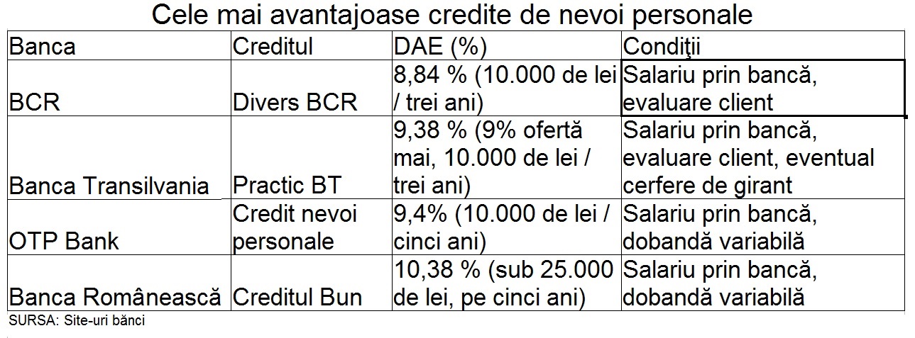 Pentru un credit de nevoi personale de 10.000 de lei, pe trei ani, dobânda anuală efectivă (DAE) poate varia între sub 9% şi 19%, potrivit celor 22 de oferte listate la cerere de platforma Conso.ro şi pe site-urile băncilor.