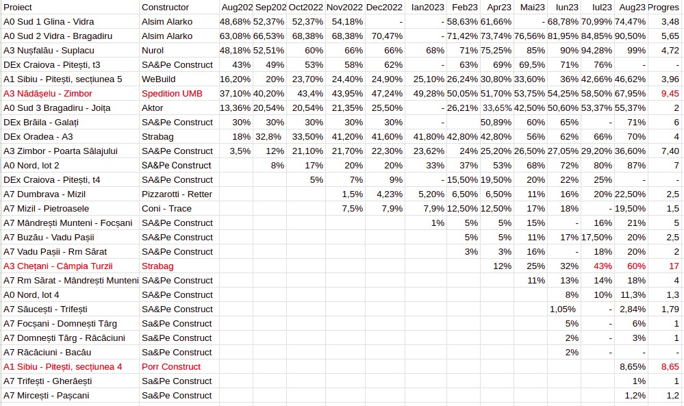 Pe restul șantierelor monitorizate, fie nu au fost raportate progrese, fie acestea au fost mai mici de 2 puncte procentuale.