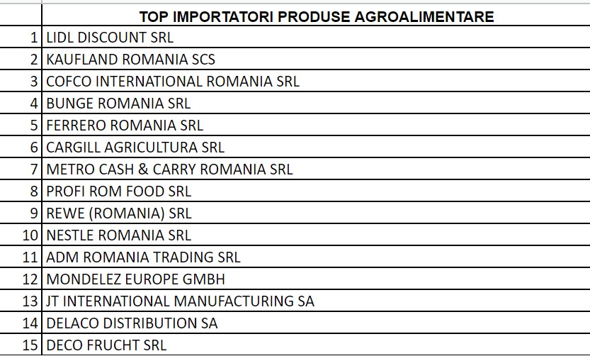 În primii 15 importatori, mai figurează alți trei retaileri alimentari- Metro Cash &Carry România, pe pozția a șaptea, Profi Rom Food, pe poziția a opta și Rewe România, operatorul magazinelor Penny, pe poziția a noua.