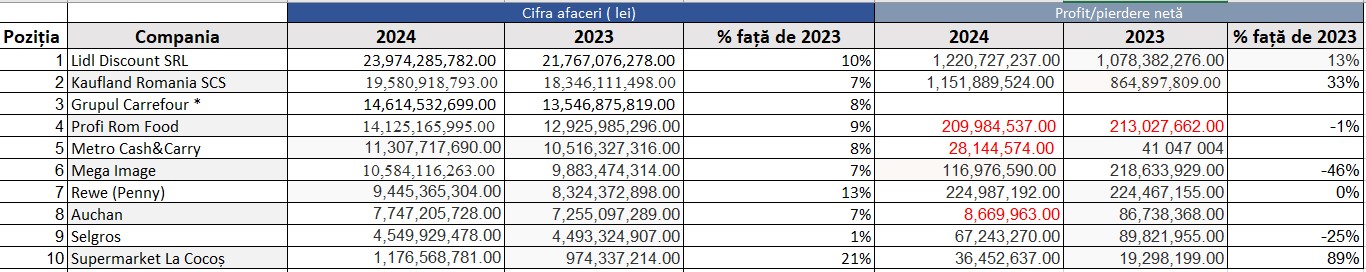 Totodată, Selgros este singurul mare retailer care a crescut sub rata de 5% a inflației, ajungănd la afaceri de 4,5 miliarde de lei ( plus 1%), în timp ce Supermarket La Cocoș, singurul retailer autohton care a depășit pragul de 1 miliard de lei, a avut cel mai mare având dintre toți, respectiv 20,7%, până la 1,1 miliarde de lei.