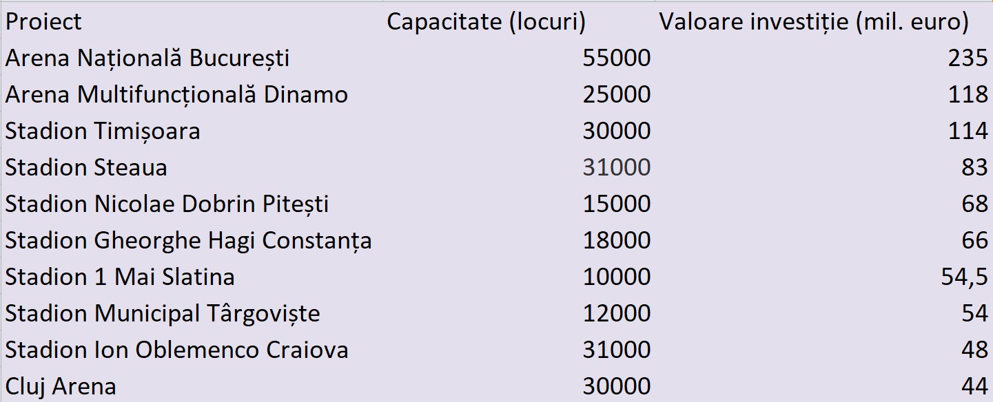 Ultimul loc este ocupat de Cluj Arena, cu 30.000 de locuri și care ar fi necesitat investiții de doar 44 de milioane de euro.