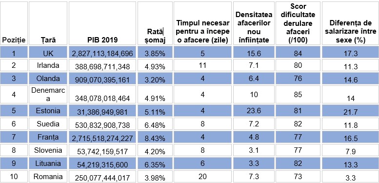 Topul Tide a fost realizat după analiza indicatorii naționali de performanță pentru 28 de țări europene, inclusiv PIB-ul, rata șomajului și aspectele practice ale înființării unei companii.