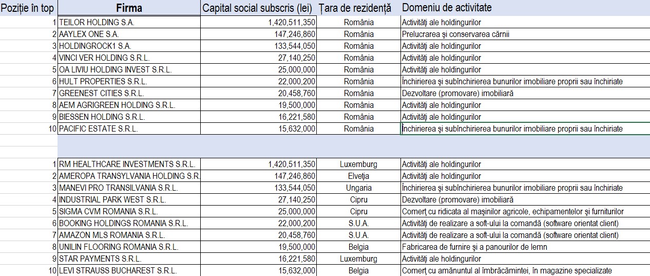 Primele zece filialele locale ale unor companii cu capital străin, în funcție de aportul pe care l-au adus capitalului social în 2021, au făcut anul trecut o infuzie de capital de aproximativ 1,8 miliarde de lei, potrivit unei analize a ONRC, la cererea Economica. Diferența este de aproximativ jumătate de miliard de lei ( 512,3 milioane de lei) față de infuzia de capital realizată de primele zece companii autohtone, catalogate după același criteriu.