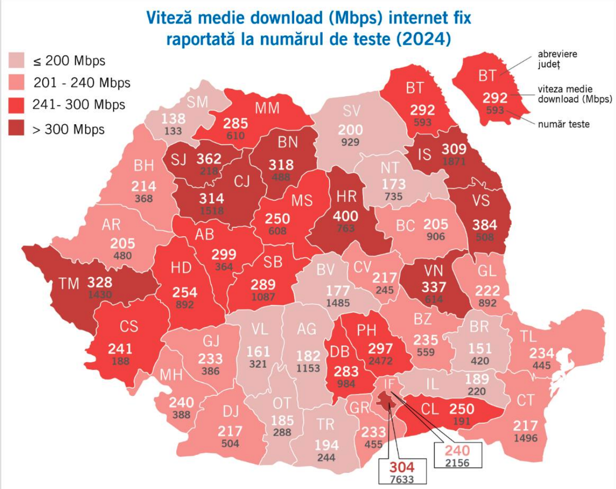 Pentru anul 2024, la nivel național, în rândul celor patru furnizori ficși, viteza medie de download pentru conexiunile de internet fix a înregistrat valori diferite de la un județ la altul, între 138 Mbps în Satu-Mare (în creștere față de valoarea minimă de 80 Mbps, înregistrată în Caraș-Severin în anul 2023) și 400 Mbps în Harghita (în creștere față de valoarea maximă de 274 Mbps, înregistrată în Prahova în anul 2023).