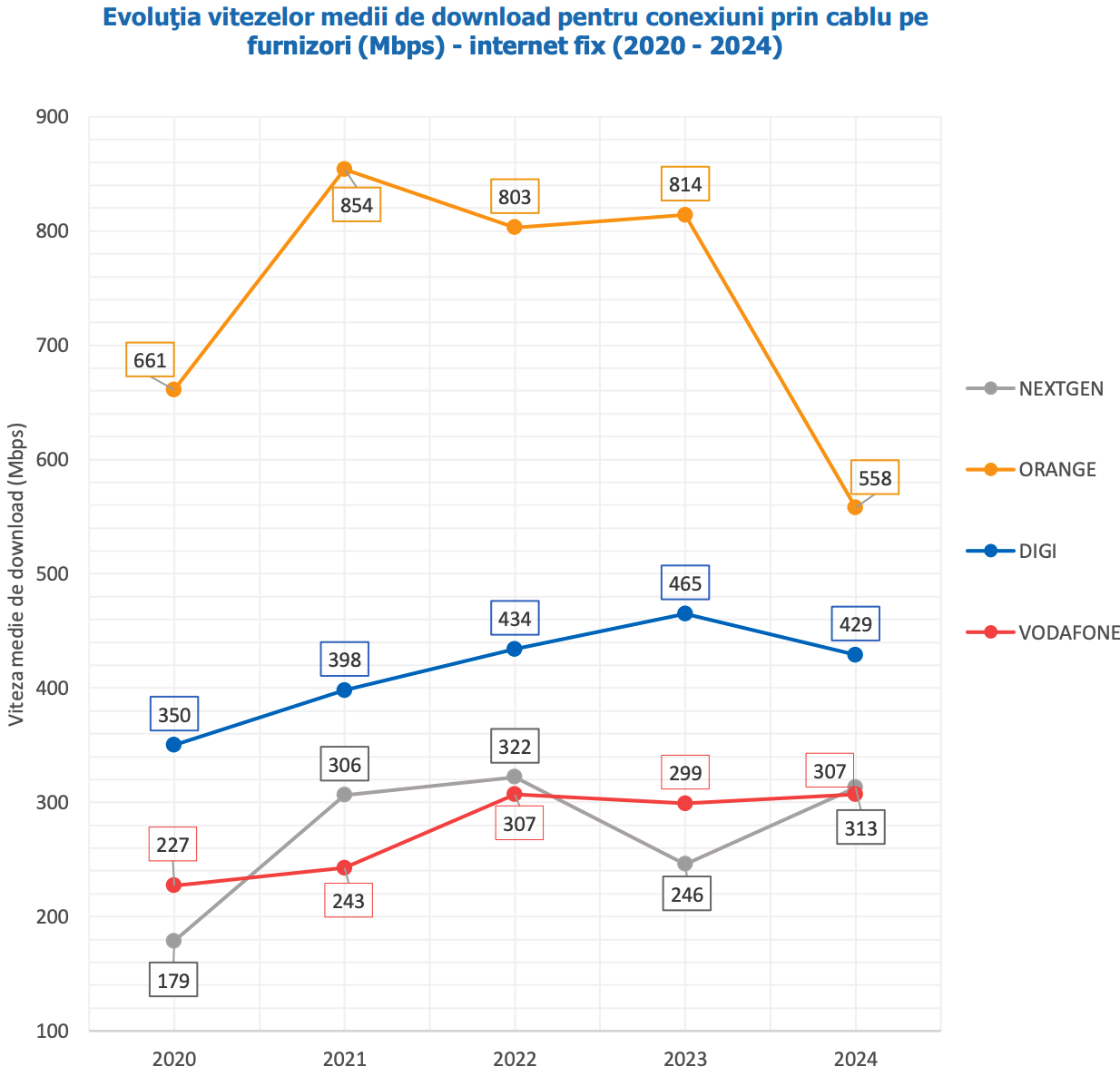 Nextgen a înregistrat creșteri ale vitezei medii de download pentru conexiuni prin cablu, de la un an la altul, până în anul 2022, în anul 2023 a înregistrat o scădere față de valoarea consemnată la nivelul anului precedent, iar în 2024 a înregistrat o creștere de 27% față de 2023.