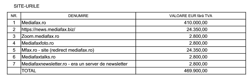 Budeanu a cumpărat şapte site-uri ale Mediafax cu 469.900 de euro fără TVA, se arată în decizia de achiziţie obţinută de Economica.net. Cel mai valoros e site-ul Mediafax.ro pentru care Budeanu plăteşte 410.000 de euro fără TVA, reiese din decizia firmei Prosperya Financial Management, obţinută de Economica.net.