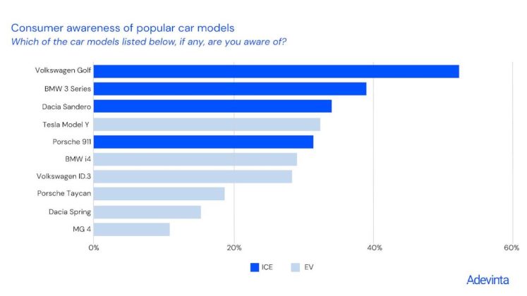 Studiul Adevinta arată că, dintr-o listă de zece modele populare de mașini, gradul de conștientizare al consumatorilor cu privire la vehiculele electrice este scăzut în comparație cu echivalentele pe benzină sau diesel. De exemplu, Volkswagen Golf (52%), BMW Seria 3 (39%) și Dacia Sandero (34%) sunt cele mai cunoscute de respondenți, în timp ce la modele electrice, 28% dintre consumatori recunosc Volkswagen ID.3, 29% cunosc BMW i4 și doar 15% cunosc Dacia Spring.