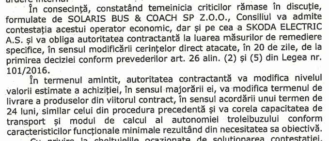„Admite contestațiile în privința valorii estimate a achiziției, termenului de livrare a produselor, capacității de transport și autonomiei troleibuzului și obligă autoritatea contractantă la modificarea cerințelor corelative în 20 de zile”, se arată în decizia CNSC.