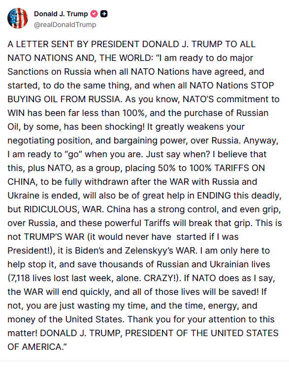 Într-o postare pe reţeaua sa de socializare Truth Social, cu titlul – scris cu majuscule – ”O SCRISOARE TRIMISĂ DE PREŞEDINTELE DONALD J. TRUMP TUTUROR NAŢIUNILOR DIN NATO ŞI DIN LUME”, şi scrisă când cu majuscule, când cu litere mici, în stilul său caracteristic, preşedintele american a apreciat că „angajamentul NATO de a CÂŞTIGA a fost mult mai mic de 100%, iar achiziţionarea de Petrol Rusesc, de către unii, a fost şocantă! Slăbeşte foarte mult poziţia şi puterea dumneavoastră de negociere asupra Rusiei. Oricum, sunt gata să ‘încep’ atunci când veţi fi şi voi pregătiţi. Spuneţi doar când?”