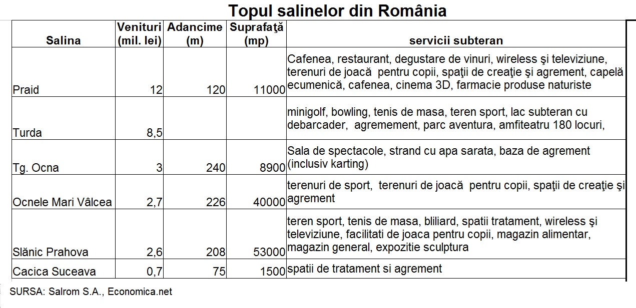 Profiturile brute ale celor şase mine de sare deschise turiştilor în România se apropie de şase milioane de lei, sau de pragul de 20% din veniturile de peste 30 de milioane de lei, potrivit datelor pe 2014 culese de ECONOMICA.NET.