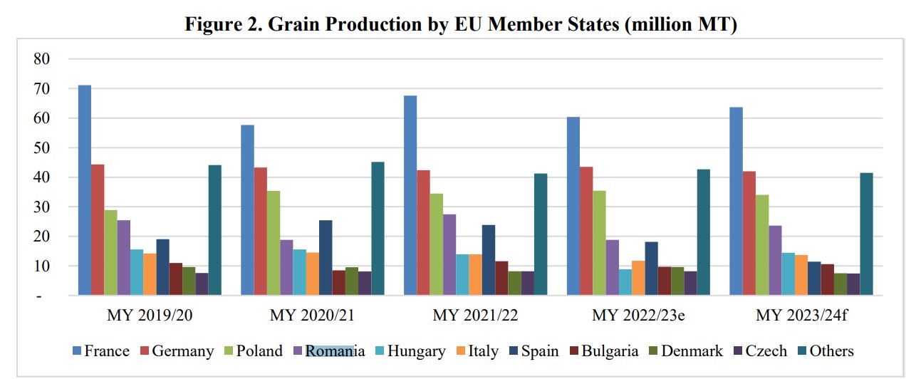 În ceea ce privește întreaga producție a UE, analiștii USDA așteaptă o redresare față de nivelurile de anul trecut când s-au produs 134,1 milioane de tone. Producția este estimată acum la 134,6 milioane de tone în anul de producție 2023/24, față de 138 milioane de tone cât se estimase inițial. În majoritatea țărilor producătoare de grâu din UE, vremea a fost favorabilă cultivării grâului, cu excepția notabilă a Spaniei, unde seceta extremă a redus randamentele