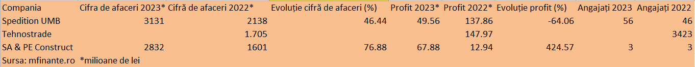 SA&PE Construct, o altă firmă din grupul UMB pentru care au fost publicate datele pe 2023, a obținut o creștere substanțială a cifrei de afaceri, de aproape 77%. Astfel, afacerile acestei companii au ajuns anul trecut la 2,83 miliarde de lei. Și profitul raportat de SA&PE Construct a crescut semnificativ, respectiv de peste cinci ori, până la 67,88 milioane de lei. Totodată, numărul angajaților pe această firmă a rămas constant, de respectiv 3.
