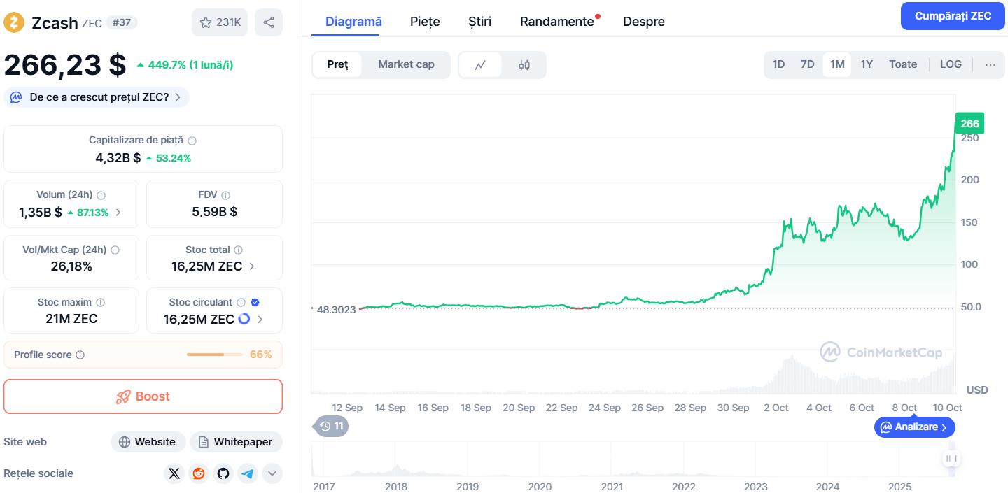 Capitalizarea sa de piață a trecut pragul de 4,30 miliarde de dolari, în creștere cu 53% în ultimele ore. Volumul zilnic tranzacționat, la fel, a crescut cu peste 87%, până la 1,35 de miliarde de dolari, semnalând un interes instituțional autentic și un flux consistent de lichiditate nouă. Practic, ZEC a devenit în ultimele două săptămâni una din top criptomonede noi în privința atenției și volumelor. Deși nu este un proiect nou, piața o tratează ca pe o redescoperire de ciclu.