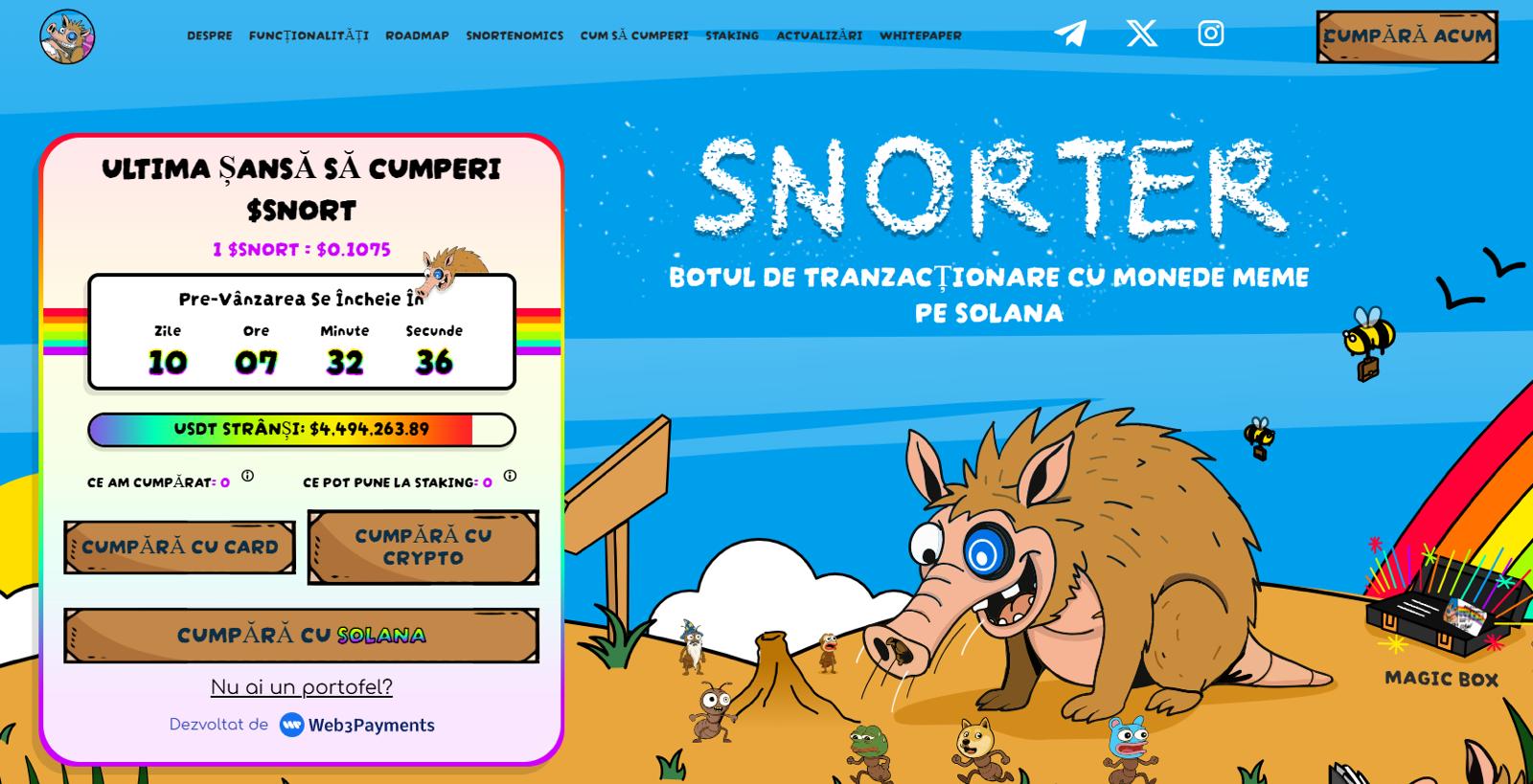 Dar utilitatea nu se oprește aici. Tokenul $SNORT este folosit și pentru staking, oferind recompense directe dintr-un fond dedicat de 25 de milioane de tokeni. Pentru un proiect care provine din zona „meme”, integrarea unor funcții concrete de trading și venit pasiv îl poziționează printre top criptomonede noi cu un plan de dezvoltare solid.
