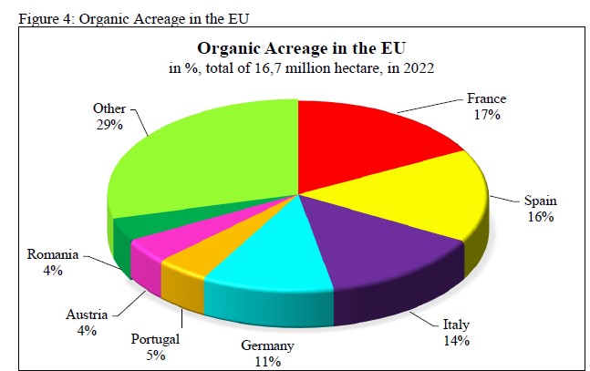 La nivelul UE, suprafața agricolă ecologică a crescut de peste două ori în ultimul deceniu. Cele mai mari suprafețe se află în Franța, Spania, Italia și Germania și, împreună, reprezintă mai mult de jumătate din suprafața ecologică a UE. Estimările EU FAS Post arată că, în 2022, existau 16,7 milioane de hectare de culturi ecologice în UE, ceea ce reprezintă o creștere de aproape trei procente de la an la an. Pentru 2023, analiștii se așteaptau la o creștere de aproximativ două procente.