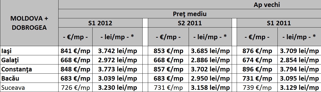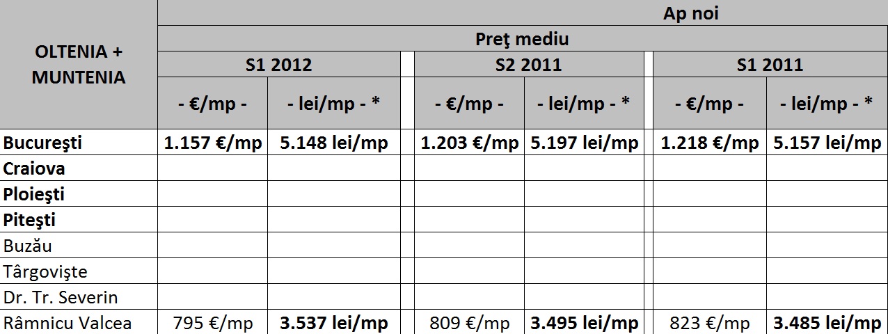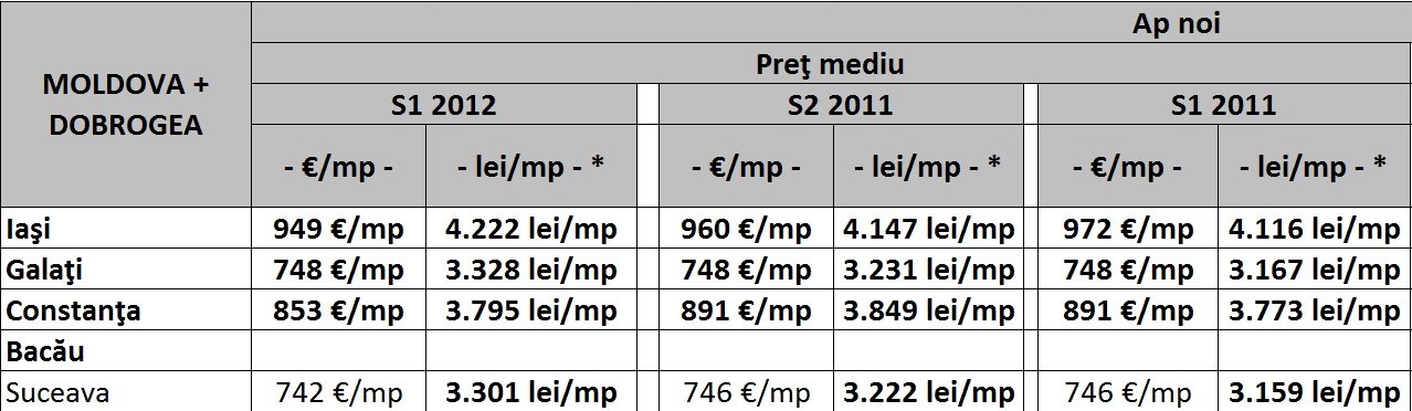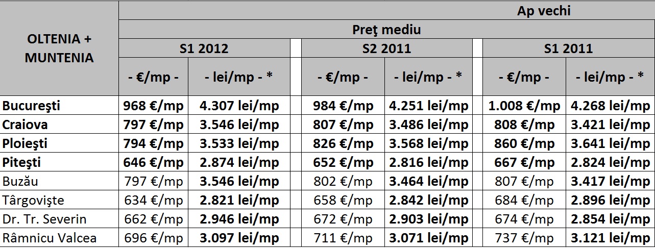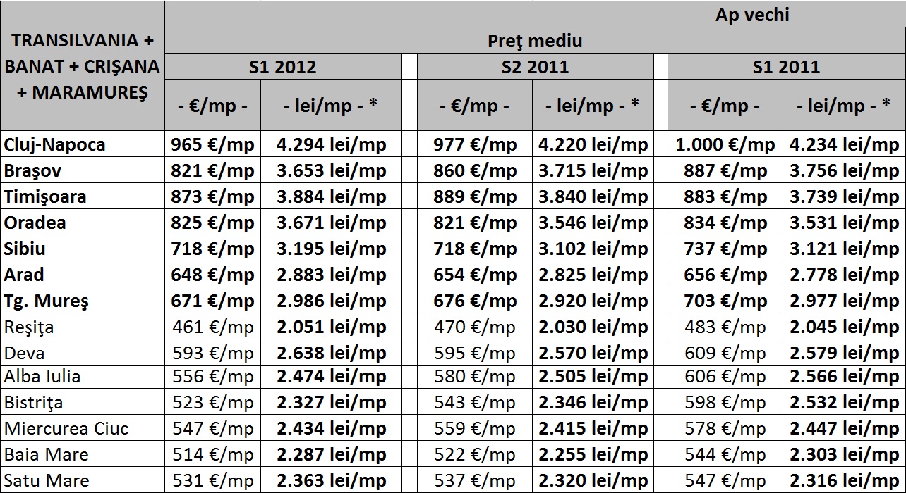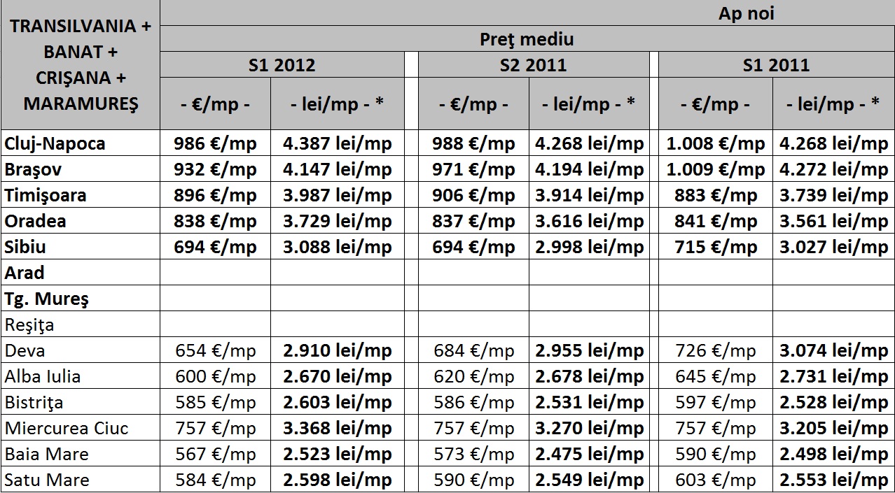 În ceea ce priveşte preţul mediu de tranzacţionare al apartamentelor noi, la nivelul celor 27 de oraşe care fac obiectul prezentei analize de piaţă realizata de compania de evaluare Darian, acesta a fost de aproximativ 785 euro/mp, în scădere cu aproximativ 2% comparativ cu aceeaşi perioadă a anului trecut. Raportat la moneda naţională de fapt apartamentele vechi au înregistrat o creştere de aproximativ 1%.