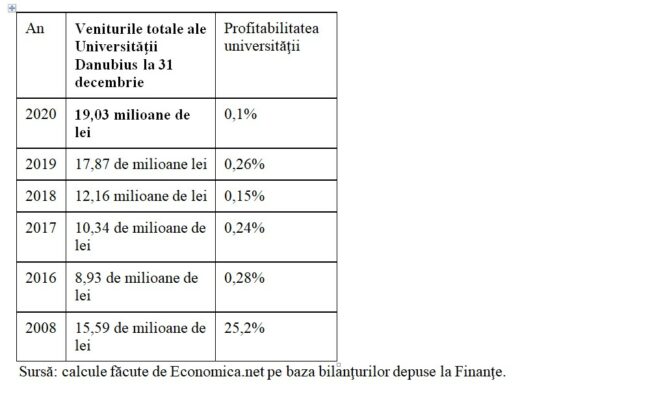 Universitatea Danubius a încheiat anul 2020 cu venituri totale de 19,03 milioane de lei, cu 6,53% mai mari decât cele rulate în 2019. Marja de profit a universităţii scade la 0,1% în anul 2020, de la 0,26% în anul 2019. Din anul 2016 încoace, profitabilitatea Universităţii Danubius e semnificativ mai mică decât cea cu care a încheiat anul 2008, de peste 25%.