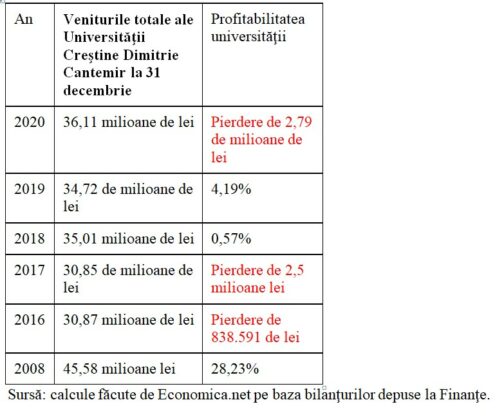 Universitatea Creştină Dimitrie Cantemir revine pe pierdere după doi ani consecutivi în care a avut excedent.