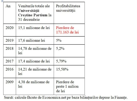 Universitatea Creştină Partium a avut venituri totale de 15,1 milioane de lei în 2020, cu 14,19% mai mici decât cele din 2019. Universitatea revine pe pierdere după patru ani consecutivi în care a avut excedent, aşa cum reiese din analizele anuale făcute de Economica.net despre subiect.