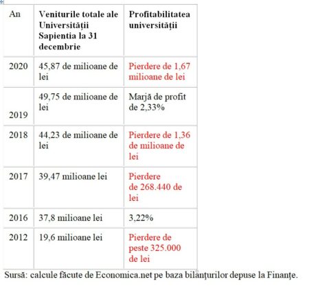Instituţia încheie însă anul 2020 cu pierdere de 2,79 de milioane de lei, după ce în 2019 a realizat profitabilitate de 4,19%, arată analiza făcută de Economica.net pe baza bilanţurilor depuse de universitate la Finanţe.