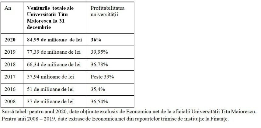 Economica.net a analizat veniturile totale şi excedentul sau, după caz, pierderile universităţilor particulare din România în anii calendaristici 2020, 2019, 2018, 2017, 2016 şi 2008, potrivit bilanţurilor trimise la Finanţe şi declaraţiilor oficialilor Universităţii Titu Maiorescu pentru anul 2020.