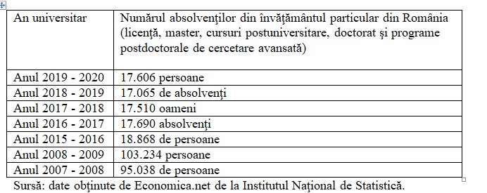 Concret, în anul universitar 2019 – 2020 am avut 17.606 absolvenţi ai învăţământului particular (licenţă, master, cursuri postuniversitare, doctorat şi programe postdoctorale de cercetare avansată), arată datele trimise pentru Economica.net de către Institutul Naţional de Statistică (INS).