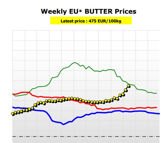Începând cu jumătatea lunii iulie, prețul untului pe piața europeană a început să crească abrupt față de perioada similară a anului trecut, arată datele Comisiei Europene. Ultimul preț, conform raportărilor din 27 octombrie, este de 475 de euro 100 de kg, adică cu 38% mai mult decât în perioada similară a anului trecut. Cu doar o săptămână în urmă, 100 de kg de unt costau în medie 432 de euro, cu 24% peste nivelul din aceeași perioadă a lui 2020. S-a atins astfel nivelul din 2018, un alt an cu prețuri mari pe perioada toamnei, dar suntem încă sub prețurile din 2017, când piața a fost grav perturbată de jocurile Franței care a creat artificial stocuri pentru a menține prețurile sus.