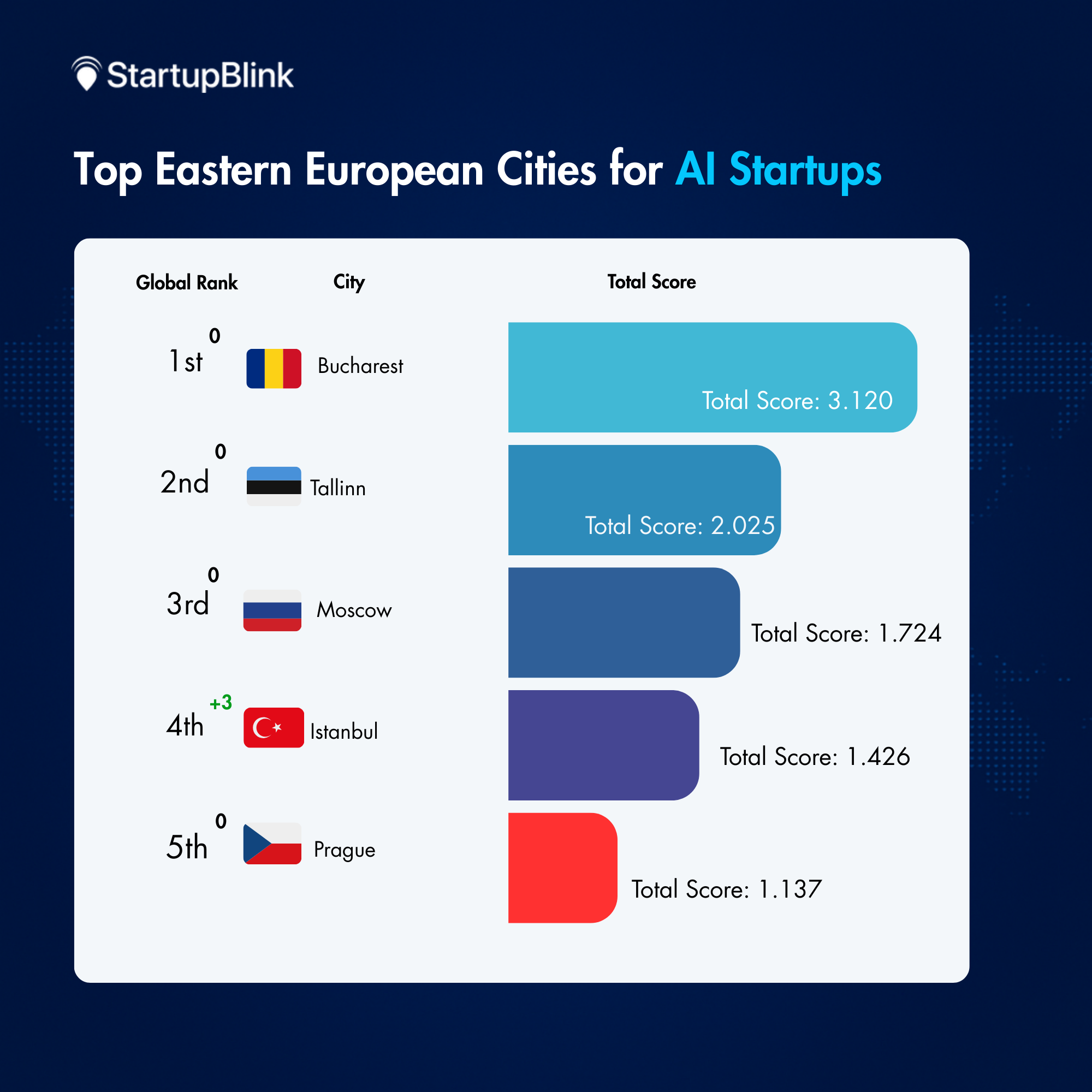 Urmează Istanbul, care înregistrează cea mai spectaculoasă ascensiune dintre primele cinci orașe din regiune: urcă 29 de poziții în clasamentul european și avansează două locuri în ierarhia est-europeană, semnalând accelerarea investițiilor și a dezvoltării ecosistemului AI din Turcia.