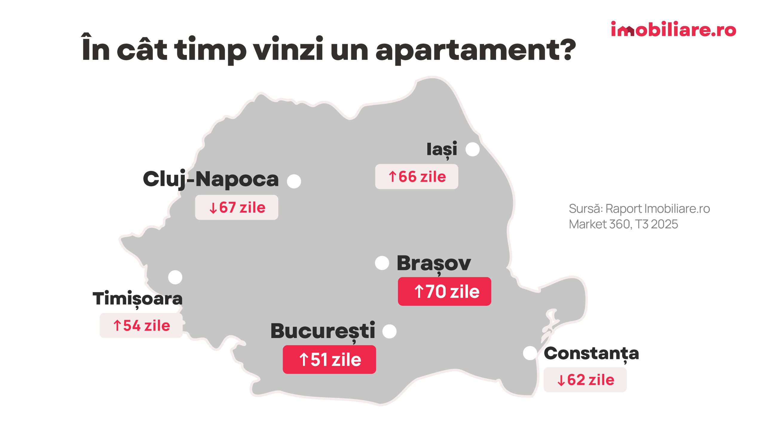 Durata medie în care un apartament se vinde a crescut de la 64 la 70 de zile între începutul anului și trimestrul al treilea din 2025, iar marja de negociere s-a extins ușor, de la 2,9% la 3,1%.