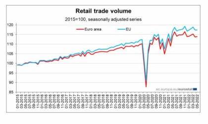 Scăderea achiziţiilor de bunuri esenţiale coincide cu creşterea record a preţurilor, rata inflaţiei în zona euro atingând nivelul record de 8,1% în mai, iar Eurostat estimează că în iunie a ajuns la 8,6%.