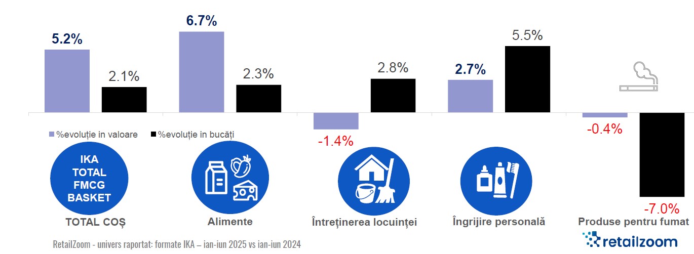 În primele șase luni din 2025 consumul a încetinit raportându-se o creștere de 1.2% față de anul trecut, în timp ce creșterea vânzărilor în valoare este 5,7%, sub rata anuală a inflației, potrivit unei analiza Retail Zoom. Aceasta după un 2024 cu o creștere de 3,8% în volum și 6,7% în valoare.