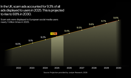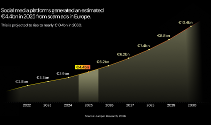 Conform raportului, europenilor prezenți pe platformele de social media li s-au afișat aproape 1 trilion de reclame frauduloase în 2025. Un utilizator mediu vede, în medie, 190 de reclame frauduloase pe lună, o cifră care se preconizează că va crește la 250 până în 2030, dacă tendințele actuale persistă. Una din 10 reclame afișate utilizatorilor de rețele sociale din Europa promovează o escrocherie.