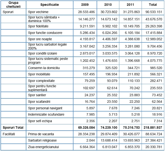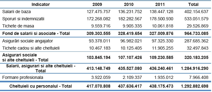Compania a cheltuit anul trecut 438 de milioane de lei cu personalul, dintre care 138 de milioane cu salariile de bază, 178 de milioane cu sporurile şi indemnizaţiile, 97 de milioane cu asigurările sociale şi 22 de milioane de lei cu tichetele de masă şi cadou.