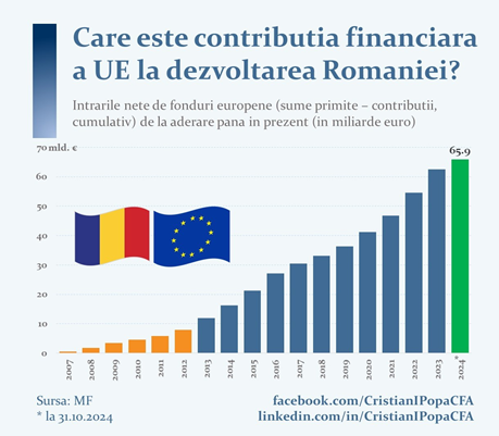 Să începem cu fondurile europene, mai exact cu imaginea completă a fluxurilor financiare dintre România și UE. De la aderare și până în prezent, România a atras fonduri europene în valoare de 97,9 miliarde de euro. Aproape 100 de miliarde de euro. În aceeași perioadă, contribuția României la bugetul Uniunii Europene a fost de aproximativ 32 de miliarde de euro. Calculul este simplu, iar rezultatul este impresionant: România a beneficiat de intrări nete de fonduri europene în valoare de 65,9 miliarde de euro în intervalul 2007 – octombrie 2024. Pentru context, întreg PIB-ul României în 2005 era de aproximativ 80 de miliarde de euro.