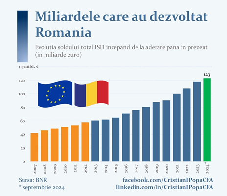 Am arătat recent că, la finalul anului 2023, soldul investițiilor străine directe (ISD) în România a depășit 118 miliarde de euro, echivalentul a aproximativ 36,4% din PIB, evidențiind avantajele unei economii deschise și conectate la piața globală. Cele mai recente date, din toamna acestui an, indică o valoare chiar mai mare, de 123 de miliarde de euro, o triplare față de nivelul înregistrat la sfârșitul anului 2007.