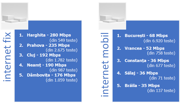 La nivel de județe, cele mai multe teste valide pentru serviciile de internet fix au fost efectuate în București (7201 teste), Prahova (2675 teste), Ilfov (2532 teste), Cluj (1782 teste) și Iași (1756 teste). Pentru serviciile de internet mobil, cele mai multe teste valide au fost localizate în București (6920), Timiș (1149), Iași (1122), Ilfov (1022) și Brașov (824).
