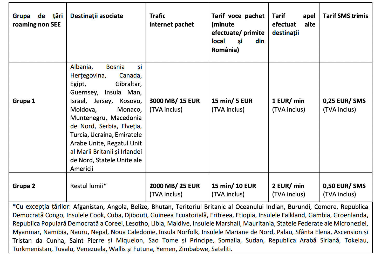 Totodată, tarifele standard naționale de voce, SMS și date se modifică astfel: 0,2 EUR/ minut si 0,05 EUR/ SMS către orice rețea națională; 5 EUR/ 5GB internet pe mobil național (indiferent de traficul consumat din totalul de 5GB). Tarifele conțin TVA și sunt aplicabile pentru abonamentele cu beneficii limitate. Tarifele de roaming în țările din afara Spațiului Economic European (non SEE) se modifică în conformitate cu informațiile din tabelul de mai jos. Pentru traficul de internet pe mobil și apelurile de voce primite și efectuate tarifarea se face pe bază de pachet. Tariful se aplică de la prima inițiere a unei sesiuni de date, respectiv apel de voce până la epuizarea pachetului. După epuizarea unui pachet se activează automat unul nou.