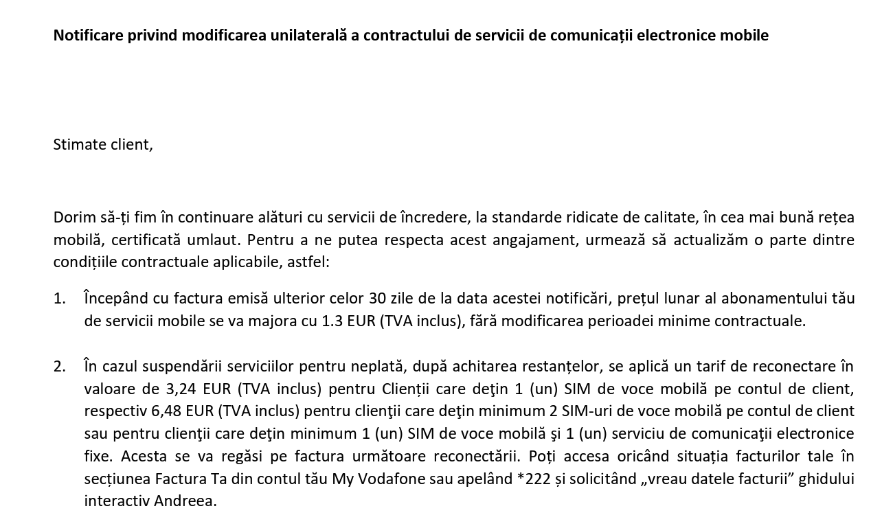 „Dacă nu ești de acord cu modificările ai posibilitatea de a denunța unilateral contractul prin intermediul unei solicitări depuse printr-una dintre modalitățile enumerate mai jos, în 30 zile de la această notificare, fără plata unor penalități sau despăgubiri. În acest caz, dacă ai achiziționat un telefon/terminal în rate, ratele rămase devin scadente la ultima factură. Poți solicita în continuare achitarea lunară a ratelor rămase, cu excepția cazului în care soliciți utilizarea numărului de telefon pe cartelă reîncărcabilă sau portarea în altă rețea”, arată compania