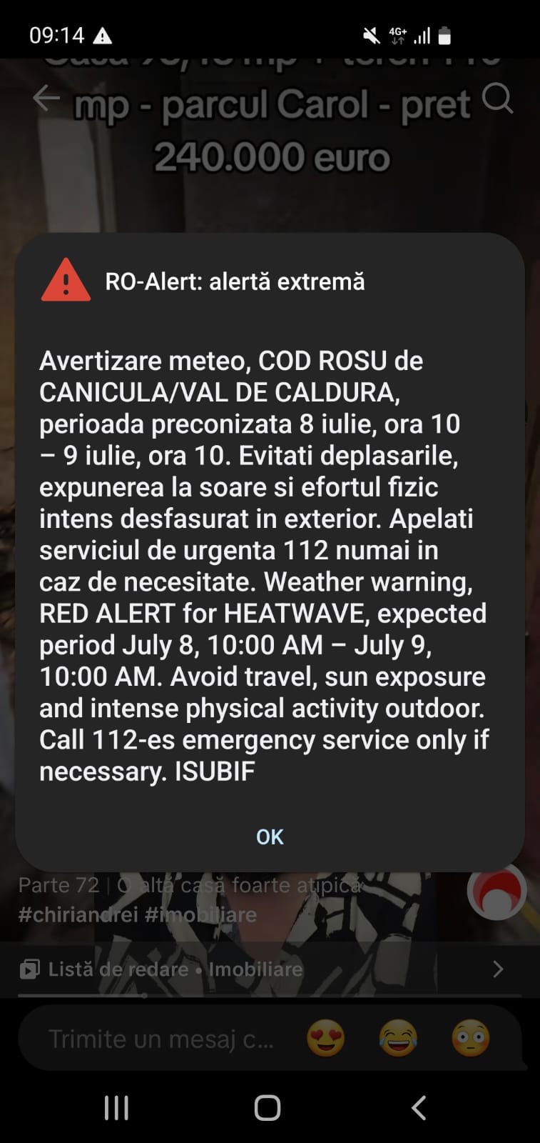 Capitala se va afla sub Cod roşu de caniculă şi marţi însă meteorologii precizează că, în intervalul 9 iulie, ora 10:00 – 10 iulie, ora 10:00, municipiul Bucureşti nu se va afla sub incidenţa unui mesaj de atenţionare/ avertizare meteorologică pentru fenomene meteorologice periculoase.