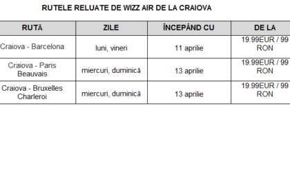 Astfel, compania aeriană a anunțat reluarea zborurilor pe trei rute de la Craiova către Barcelona (Spania), Paris Beauvais (France) și Bruxelles Charleroi (Belgia). Împreună cu aceste rute redeschise, Wizz Air operează acum 10 rute din Craiova. Biletele sunt deja disponibile online pe wizzair.com și prin intermediul aplicației pentru mobil începând cu 99 de lei.