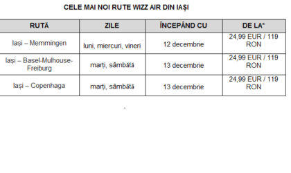 Cu cea de-a patra aeronavă la bază și noile rute adăugate rețelei din România, Wizz Air este cea mai mare companie aeriană care operează din Iași, reiterându-și angajamentul de a oferi destinații populare și tarife scăzute cât mai multor pasageri, în cel mai sustenabil mod posibil. Românii pot călători acum de la Iași la Memmingen în zilele de luni, miercuri și vineri, începând cu 12 decembrie 2022. În plus, zborurile către Aeroportul Basel-Mulhouse-Freiburg și către Copenhaga vor decola ambele din Iași în fiecare marți și sâmbătă, începând cu 13 decembrie.