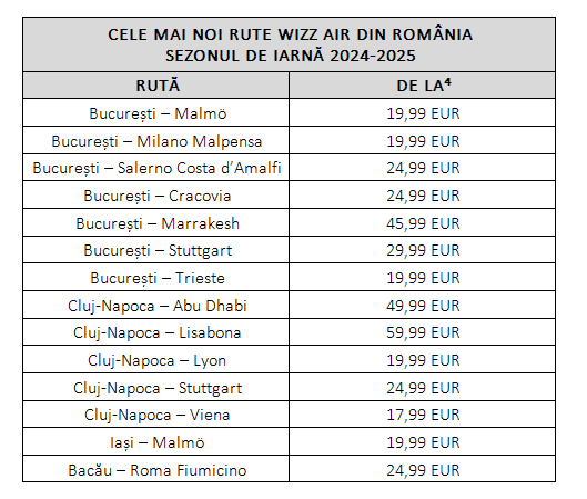 „Suntem încântați să intrăm în cel mai mare sezon de iarnă de până acum, oferind zeci de rute noi pe care clienții noștri le pot explora. Suntem bucuroși să inaugurăm 14 rute de pe diferite aeroporturi din România, oferind aproape 5 milioane de locuri clienților noștri, cu și mai multe opțiuni de călătorie directă și mai multă flexibilitate. Aceste noi rute evidențiază angajamentul nostru de a ne extinde rețeaua și de a oferi pasagerilor noștri opțiuni de călătorie accesibile. Dotați cu flota noastră de ultimă generație, aflată în continuă creștere, investim continuu în îmbunătățirea performanței noastre operaționale și a experienței clienților, menținând în același timp cele mai înalte standarde de sustenabilitate din industrie”, a declarat Anastasia Novak, Corporate Communication Manager la Wizz Air.