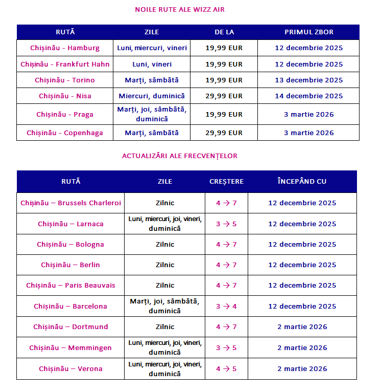 Cele două aeronave Airbus A320ceo, care vor sosi în decembrie 2025 și martie 2026, vor permite lansarea de rute directe cu Wizz Air din Chișinău către Hamburg, Torino, Frankfurt Hahn, Nisa, Praga, Copenhaga, dar și creșterea frecvenței pe unele dintre cele mai populare destinații deja operate, precum Bruxelles, Larnaca, Bologna, Berlin, Paris, Barcelona, Dortmund, Memmingen și Verona.