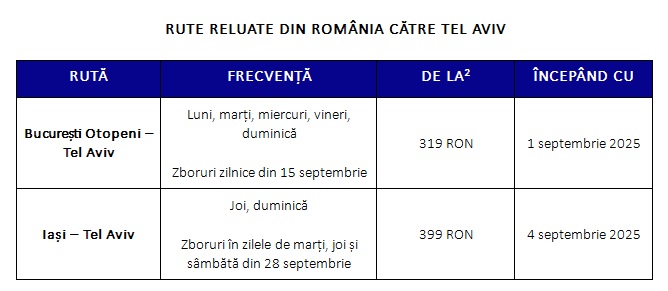 Pe măsură ce călătoriile aeriene se redeschid în regiune, Wizz Air marchează o revenire pe rutele către Tel Aviv mai devreme decât era planificat. Biletele sunt deja disponibile pe wizzair.com și prin aplicația mobilă WIZZ, cu prețuri începând de la 319 de lei pentru București și 399 de lei pentru Iași.