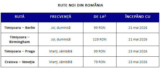 Două noi rute din Timișoara către Berlin (Germania) și Birmingham (Regatul Unit) vor fi inaugurate în 21 mai, cu zboruri în zilele de joi și duminică. În data de 23 mai, o altă rută, către Praga (Cehia), va fi adăugată programului de la Timișoara, cu zboruri în fiecare marți și sâmbătă. Tot în 23 mai, Wizz Air va lansa zboruri din Craiova către Veneția (Italia), operate marți și sâmbătă.