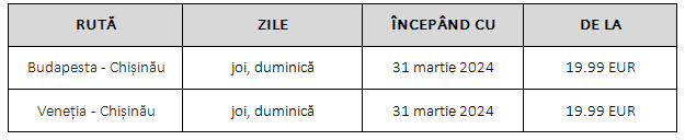 Compania aeriană va zbura de două ori pe săptămână de la Budapesta și de la Aeroportul Marco Polo din Veneția către Chișinău. Decizia companiei aeriene reconectează capitala Moldovei cu destinații importante, dar urmărește, de asemenea, să îmbunătățească accesibilitatea și confortul pentru pasagerii săi.